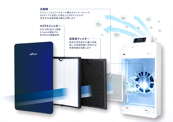 「HEPAフィルター」と「活性炭フィルター」「光触媒」を搭載